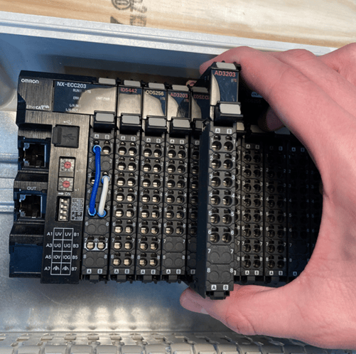 Omron I/O systems allow terminal blocks to be removed independently of the I/O card.