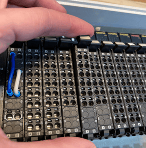 When removing the card that needs to be replaced/changed you can let the wires stay put in the terminals by removing the terminals via. the lever. This is especially handy for the cards (on right-hand side of the defective one) when these are to be dismounted before exchanging the defective card.